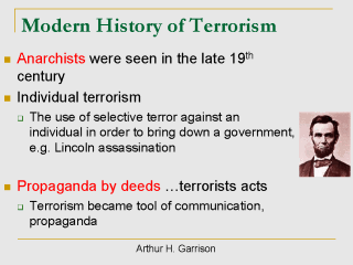 public officials, e.g. the killing of a president or ruler. Terrorism has become a statement. Arthur H. Garrison, How the World Changed: a History of the Development of Terrorism, presented at Delaware criminal Justice Council Annual Retreat, Oct 28-29, 2001 |