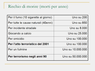 Medical Association, Penguin Books, 1987. Il rischio di morte per terrorismo è stato calcolato sulla base dei dati di poplazione degli USA e dei morti per atti terroristici Stime della popolazione residente degli Stati Uniti, per età e sesso: dal 1 aprile 90 al 1 luglio 99, con proiezione a breve fino al 1 novembre 2000: eire.census.gov/popest/archives/national/nation2/intfile2-1.txt |