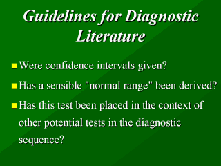 Question 8: Were confidence intervals given? (Greenhalgh, 1997) A confidence interval, which can be calculated for virtually every numerical aspect of a set of results, expresses the possible range of results within which the true value will probably lie. If the jury in the first example had found just one more murderer not guilty, the sensitivity of its verdict would have gone down from 67% to 33%, and the positive predictive value of the verdict from 33% to 20%. This enormous (and quite unacceptable) sensitivity to a single case decision is, of course, because we validated the jury's performance on only 10 cases. The larger the sample, the narrower the confidence interval, so it is particularly important to look for confidence intervals if the paper you are reading reports a study on a relatively small sample. - Question 9: Has a sensible "normal range" been derived? (Greenhalgh, 1997) If the test gives non-dichotomous (continuous) results—that is, if it gives a numerical value rather than a yes/no result—someone will have to say what values count as abnormal. Defining relative and absolute danger zones for a continuous variable (such as blood pressure) is a complex science, which should take into account the actual likelihood of the adverse outcome which the proposed treatment aims to prevent. This process is made considerably more objective by the use of likelihood ratios. - Question 10: Has this test been placed in the context of other potential tests in the diagnostic sequence? (Greenhalgh, 1997) In general, we treat high blood pressure simply on the basis of a series of resting blood pressure readings. Compare this with the sequence we use to diagnose coronary artery stenosis. Firstly, we select patients with a typical history of effort angina. Next, we usually do a resting electrocardiogram, an exercise electrocardiogram, and, in some cases, a radionuclide scan of the heart. Most patients come to a coronary angiogram only after they have produced an abnormal result on these preliminary tests. If you sent 100 ordinary people for a coronary angiogram, the test might show very different positive and negative predictive values (and even different sensitivity and specificity) than it did in the ill population on which it was originally validated. This means that the various aspects of validity of the coronary angiogram as a diagnostic test are virtually meaningless unless these figures are expressed in terms of what they contribute to the overall diagnostic work up. |
