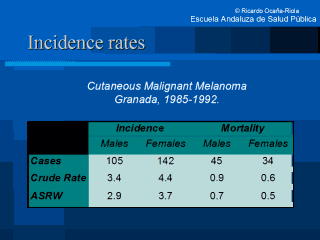 During 1985-1992, 247 cutaneous melanoma cases were registered in Granada: 105 males and 142 females. Annual average crude rates corresponding to this time period were 3.4 and 4.4 per 100,000 inhabitants for males and females respectively. The ASRW was 2.9 per 100,000 for males and 3.7 per 100,000 for females. |