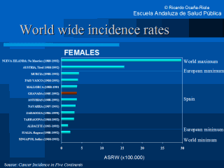 The highest incidence rates for females world-wide are those of New Zealand’s non Maori population, the majority of whom are of European origin [5]. Different case-control studies have confirmed the important role of skin phenotype. Risk for melanoma has been associated with several indicators of fair coloring and with an ethnic background related to historically lighter pigmented populations. Blue eyes colour, blonde hair, fair complexion, tendency to sunburn and intermittent sun exposure have been detected as important factors associated with a greatest risk of Cutaneous Malignant Melanoma [15-17; 19]. |