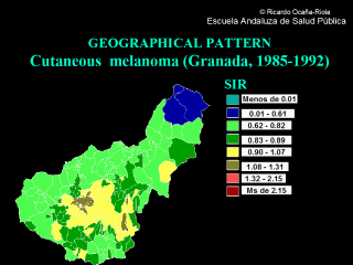 The highest incidence rates are located in the city of Granada (county town) and all the municipalities around it. Different studies have confirmed the important role of ecological factors. Risk for melanoma has been associated with several indicators of high socioeconomic level [14]. This fact could be an explanation of the incidence rates founded around the city of Granada. |
