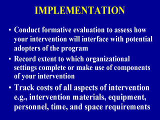 | The goal of Implementation in research phases is to evaluate how the intervention was delivered to participants and how the intervention was received by individuals. If the intervention is too complicated, too intensive, or not compatible with how it needs to be delivered by others, chances are it will not have the intended impact. |