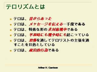2001年9月11日の世界貿易センターへのテロ攻撃は、世界をあっと言わせました。しかし、テロは決して、新しいものではないこと、その一義的な目的は殺傷ではないことをしっかりとおぼえておくことはとても重要です。テロは暴力の一種であり、昔から存在しており、またテロは政治的行為です。