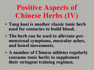blood regularly and need to replenish it constantly. In addition to the relief of pre-menstrual symptoms (e.g., Bensky and Gamble, 1993), tang kuei is often used for the purposes of alleviating muscular aches and bowel movements. It has been used in combination with some other tonic herbs including ginseng. The common English name of tang kuei is Angelica sinensis. Like ginseng, only the root of this plant is used for the tonic properties mentioned above. It has been said that many great Chinese athletes, including those who shattered several world records, supplement their stringent training regimen with regular consumption of one or more tonic herbs such as ginseng, huang qi, or tang kuei. For a further understanding of Chinese tonic herbalism in the English literature, students are referred to the recent book by Teeguarden (2000), entitled The Ancient Wisdom of the Chinese Tonic Herbs. |