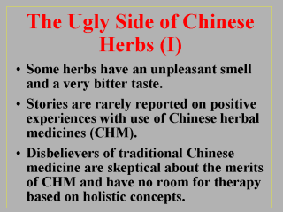 the generally unpleasant smell and bitter taste, the part that makes many Chinese herbal