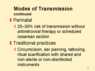 | The third major mode of HIV transmission is mother-to-child transmission during pregnancy, labor and childbirth, or with breastfeeding. Without access to therapies known to decrease risk, perinatal transmission occurs in 25–45% of pregnancies where the mother is HIV-infected. The risk of HIV transmission from traditional practices, such as female circumcision, ear piercing, tattooing or ritual scarification with shared and non-sterile or non-disinfected instruments, is unknown. |