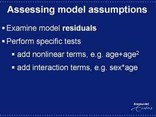 residuals, defined as the difference between predicted and observed outcome. Also, specific statistical tests can be done by adding nonlinear or interaction terms. |