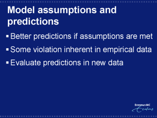 | Model assumptions are important for the quality of predictions from a regression model. Better predictions will result from a model that satisfies its underlying assumptions. However, assumptions can never be fully met in empirical data, and evaluation preferably focuses on the validity of the predictions in new patient data. |