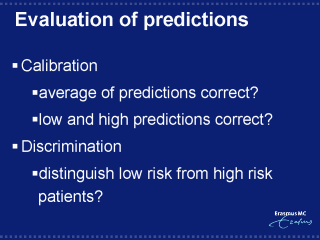 outcomes and time-to-outcome data. Calibration (or ‘reliability’) refers to the agreement of predicted and observed predictions, e.g. 70% predicted = 70% observed? Calibration can be studied on average, and more specifically for patients with low and high predictions. Hereto, regression techniques are useful where an intercept and slope can be estimated for the predictions (see next graph). Discrimination refers to the ability to distinguish low from high risk patients. For binary outcomes, discrimination can be quantified by the area under the receiver operating characteristic (ROC) curve. This curve is constructed by plotting sensitivity against 1-specificity for different cut-off points for the predicted risk. The area indicates the probability that a patient with the outcome had a higher predicted probability than a patient without the outcome, for random pairs of patients with and without the outcome. |