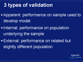 | The previous graph showed the apparent validity of a regression model. It is of more interest to study the internal validity, that is the performance on an underlying population (also labelled ‘reproducibility’), or external validity, that is the performance on a different population (also labelled ‘generalizability’ or ‘transportability’). |