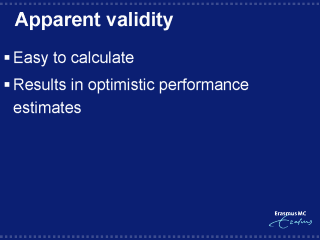 | Apparent performance is attractive because it is easy to perform. It however results in optimistic estimates of performance, especially when a complex modelling strategy was followed in a relatively small data set, e.g. selection from a large set of candidate predictors. |
