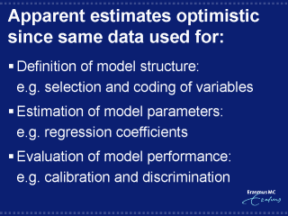 because the same data are used for development and testing. Model development usually includes defining the model structure based on findings in the data (e.g. strong, ‘independent’, predictors are selected). Model parameters are usually estimated as if the model structure was pre-specified. Modern estimation techniques are available that take uncertainty in model structure into account, but these are not yet applied routinely in medical research. The apparent model performance may be satisfactory, since the model was fine-tuned for the development data. Testing in new patients may show disappointing results. |