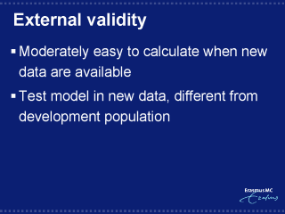 | External validity is moderately easy to calculate if appropriate data are available, e.g. containing the predictor and outcome variables required for the prediction model. The concept of external validation is simple: predictions are calculated from the previously developed model, and tested in new data that are different from the development population (e.g. from another hospital). |