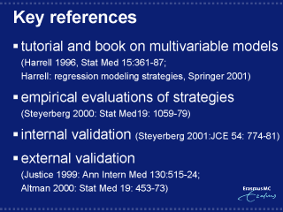graph in this lecture comes from an accompanying and on-line available data set: Techniques for internal validation (Steyerberg et al, 2001) and issues related to external validation have been described (Justice et al, 1999; Altman & Royston, 2000). For reasons of space, several other important references are not shown here. |