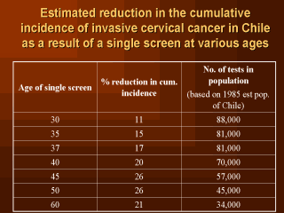 An example of the estimated reduction in cumulative incidence of invasive cervical cancer as a result of a since screen at various ages in Chile.