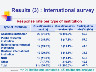 summarises the participation rate of the researchers contacted for the survey. Study sample: 91 insitutions contacted, out of which 49 replied to the questionnaire. Results show a high participation rate from academic institutions, the lowest being from the international and bilateral insitutions. |