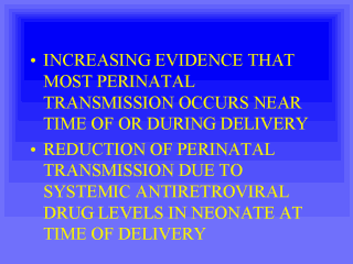 drug levels in neonate @ time of delivery - Intense exposure to HIV in maternal genital secretions during delivery ZDV administration intrapartum & to newborn provides pre- and post-exposure prophylaxis |
