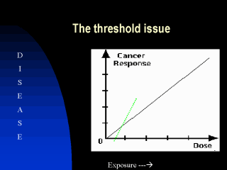 | If the black line intersecting zero is “correct”, there is theoretically some “risk” at any level of exposure (although the probability of that risk may be effectively none at zero). This is almost a convention in cancer risk assessment, but may be wrong if the GREEN line is correct, which suggests that there is ZERO theoretical risk below the exposure at which the green line intersects the X (exposure) axis. |