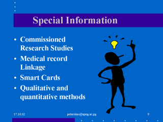rely on routine statistics. Further analysis and regrouping can be helpful when data sets can be combined. Thus record linkage allows a patient’s hospital record in several different hospitals, the primary care record and social data to be integrated. The advent of an electronic patient record, carried by the patient like a Visa or American Express card (Smart Cards) enables data to be instantly available on previous history, medications, health problems wherever doctor - patient interaction occurs. The card can access a national or international database for updating as well as providing summary data. As these systems come into common use the medical and surgical interventions will provide a real time data base which can be linked to the unit providing care. Patient: Peter X. 60 year old male Unique Identifier KVHF 42 4 day admission Hospital A with Myocardial Infarction 1997 Cost $10,000 5 day admission to Hospital B for CABG, 1999, Cost $2,000 Drug Profile Atenolol100mg, Captopril 25mg, Aspirin 25mg 500$/month Qualitative methods have become popular in an attempt to address Consumer expectations and a service sensitive to needs. e.g. Focus groups, consumer surveys. |