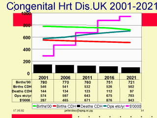 part of trying to predict future trends, service developments and cost implications. This graph attempts to predict the future service load and cost implications for people born with Congenital Heart disease in part of the United Kingdom. The number of people born with CDH will decline slightly (Intra-uterine diagnosis, termination) and as treatments and care improves (surgical techniques, gene therapy, transplants) the mortality will decline. There is already a significant population of CDH survivors who will require ongoing treatment and care, the number of surgical procedures will increase. The cost of the service will continue to rise throughout the study and shows no likelihood of levelling off in the next 20 years. |