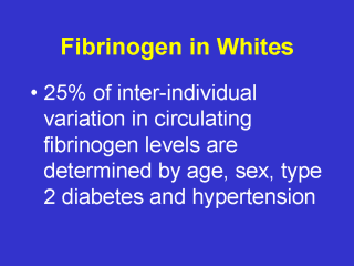 the Northwick Park Heart Study. Lancet 1986; 2(8506):533-537. Folsom AR, Qamhieh HT, Flack JM, Hilner JE, Liu K, Howard BV, Tracy RP. Plasma fibrinogen: levels and correlates in young adults. The Coronary Artery Risk Development in Young Adults (CARDIA) Study. Am J Epidemiol 1993; 138(12):1023-1036. Kannel WB, D'Agostino RB, Wilson PWF, Belanger AJ, Gagnon DR. Diabetes, fibrinogen, and risk of cardiovascular disease: The Framingham experience. Am Heart J 1990; 120:672-676. Lee AJ, Smith WC, Lowe GD, Tunstall-Pedoe H. Plasma fibrinogen and coronary risk factors: the Scottish Heart Health Study. J Clin Epidemiol 1997; 43(9):913-919. |