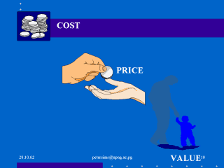 estimate of the various inputs into providing a service or a consumer object. e.g. A motor car - raw materials, research and development, design, plant, equipment, worker training, worker pay, advertising, distribution, administration. An operation - key materials e.g. blood, anaesthetic agents, drugs, immunisations, hotel and catering services, nursing services, medical services, equipment, plant, administration. For each service there is an element for staff training, accreditation and pay. The price is the financial value attached to the object or service in a particular market place. It will vary by time, geography and need. It will be vary with quality and demand perhaps created by skilful advertising. The value is subjective and qualitative, thus a cheap wedding ring has huge symbolic significance and value to the wearer. In health care a huge amount of resource may be devoted to trying to save a single human life - a child injured in an accident or an adult with terminal cancer, because the individual is so valued. |