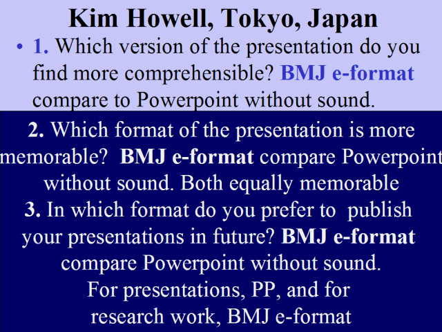 spent in front of a screen, paper is more pleasant… Kim Howell, not a Supercourse faculty, Editor, Excerpta Medica, Japan Extra comments: 1. "I was enjoying reading the uploaded comments until, at around posting 19, no more text appeared on my computer screen - I have no idea why. Furthermore, when I tried to use the review form, the 'submit' button didn't work. These are certainly major disadvantages with this system. Any comments?" 2. «In your letter to the BMJ, you say that this survey was designed to compare the '3 century old journal publication model with PowerPoint scientific communication model' and your analysis of the first 13 forms concludes that PowerPoint is 'a better means of Research Communication that [sic] journals'. The survey questions compared only BMJ _e-format_ and PowerPoint (with or without sound); comparison with the paper journal was not invited. The conclusion should specify this, i.e. 'PowerPoint is a better means of research communication than journal e-format'. The current wording suggests that PowerPoint is better than both electronic _and_ paper journals. Regarding the letter to the BMJ, you say that 'We would very much appreciate if more scientists (not editors!!!) would comment upon which format is best.’ I have worked in research, academic, and publishing environments. Does my PhD allow me to respond as a scientist? Or does my editorial work disqualify me from commenting? Many scientific copy-editors are ex-scientists. Many academic editors are scientists. Are comments from general, non-scientist readers welcomed? |