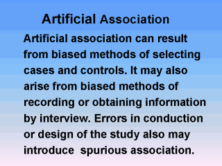 | Biased selection of case and controls in a study, and difference in phrasing questions could lead to a difference in the response of case and controls, resulting in spurious association. Also this artificial association could result from errors of study design e.g. misclassification of study or disease, measurement errors, loss to follow-up and observer bias. |