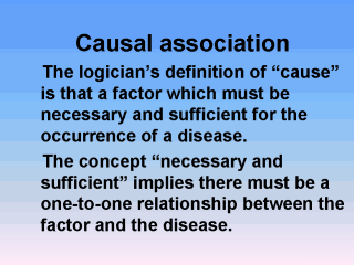 | The term necessary refers to the fact that the factor must be present for the disease to occur, while sufficient means that the factor alone can lead to the disease. Whenever the factor is present, the disease must occur. However, in infectious diseases, microorganism is not necessary and sufficient for disease development. e.g. Tubercle bacilli. |