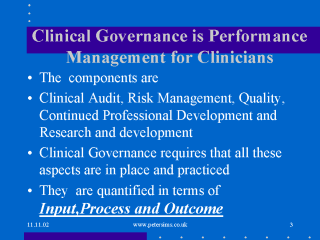 daunting and difficult to the busy clinician. Where will the time and money for this activity come from? Where to start? The answers are that it is difficult, costly and hard to fit in unless there is real dialogue with Management. It should start small and simple and not try too much too soon. One area in each of the components, Every year, Input and Process initially e.g. Risk management - (Input and Process) Fire Policy Fire extinguishers in place, checked, dated and staff trained. |