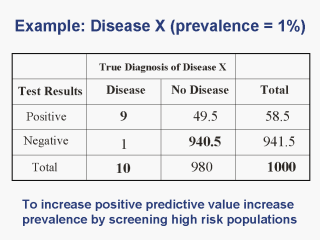 (1,000 x 0.01 = 10) Sensitivity = 9/10 = 90% Specificity = 940.5/990 = 95% Positive Predictive Value = 9/58.5 = 14.5% Negative Predictive Value = 940.5/941.5 = 99.9% |