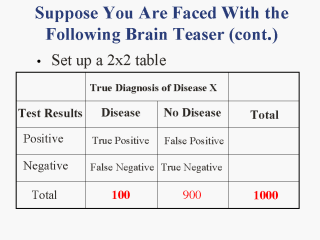 population is 1,000, then 100 people are sick This means 900 are not Since the sensitivity is 95%, 95% of the 100 truly sick will test as true positives (n=95) Since the specificity is 90%, 90% of the 900 truly well will test as true negatives (n=180) Fill in the blanks |