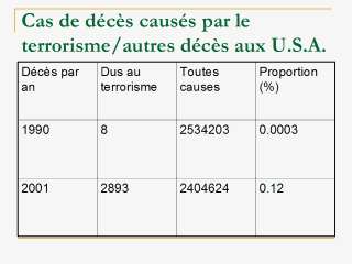 terrorism only occupies a very small proportion in all causes of deaths. Total International Terrorist Attacks, 1981-2000. Department of State Publication, Office of the Secretary of State, Released by the Office of the Coordinator for Counter terrorism, April 2001. http://www.usis.usemb.se/terror/rpt2000/totaluscasualties.html * Used projected data of year 2000 National Vital Statistics Report, Vol.49 No. 12, Oct 9, 2001 National mortality data: http://wonder.cdc.gov/mortICD9J.shtml Death from September 11th: |