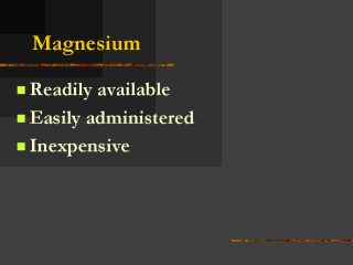 to minimize the insult incurred with myocardial ischemia. Enhancing calcium influx at the time of reperfusion with inotropes, such as isoproterenol, exacerbates myocardial stunning. If inotropes are started late in reperfusion on already stunned myocardium, the expected positive inotropic response is noted. The use of magnesium before surgically induced myocardial ischemia, during, or at the time of myocardial reperfusion appears to improve postischemic mechanical recovery. The accumulated experimental and clinical data on magnesium support the contention that magnesium decreases reperfusion injury, infarct size, the incidence of postoperative arrhythmias, and mortality. Magnesium is readly available, easily administrated, and inexpensive. |