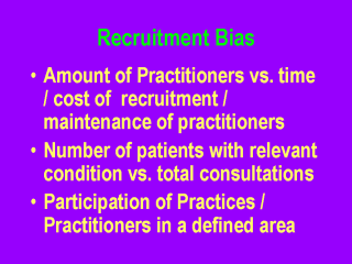 maintaining the motivation of these practitioners. Problems are more acute within primary care where, even for common conditions,the number of patients that practitioners see with the disease of interest represents only a small proportion of their total consultations. Not all practices within a defined catchment area may agree to participate in a trial and the selected group of practitioners who agree to recruit patients can affect the representativeness of study population. Practitioners with a particular interest in condition under investigation may be more likely to participate and may manage patients more effectively than the average practitioner, thus decreasing the effect size observed. |