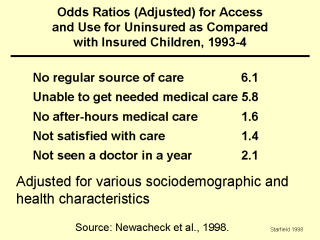 care than it does on various other aspects of access and use of services. Source: Newacheck PW, Stoddard JJ, Hughes DC, Pearl M. Health insurance and access to primary care for children. N Engl J Med 1998; 338(8):513-519. |