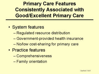 | There are 5 characteristics that distinguish better primary care from the poor primary care countries. Three of the 5 are system characteristics, and two are practice characteristics. |
