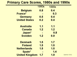 for the 1990s The average of the scores for each country’s policy and practice characteristics constituted its primary care score. The countries were found to fall into three groups: those with low scores (less than .5), those with intermediate scores (scores of .8-1.2), and those with high scores (scores 1.4 or greater). Scores were relatively stable from the first time period to the second. Comparison of scores from the 1980s with those from the 1990s indicate relative stability and no change in the grouping of countries. |