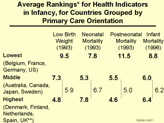 thus, lower average ranks indicate better performance. **England and Wales only For perinatal and infant health, the indicators were percentage of infants born at low birthweight, neonatal mortality rate (first month of life), postneonatal mortality rate (1-11 months of life), and infant mortality (death rate in the first year of life, or neonatal plus postneonatal mortality). For low birthweight and postneonatal mortality, the better the primary care orientation of each group of countries, the better the average rank of the countries in the group. For neonatal mortality, which is more responsive to technology intensive specialty care, the middle group of countries did best, perhaps due to their greater expenditures on the health care system in general. |
