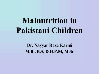 | Malnutrition is one of the most prevalent Public Health Problems in Pakistan. It is one of the major underlying factor for high Infant and Under 5 Mortality rate in Pakistan. Poverty, lack of Education, Poor environmental hygiene and food fads are some of the reasons for its high prevalence in Pakistan. In this lecture, I have tried to explain, what is the magnitude of Malnutrition in Pakistani Society, its causes, types, diagnosis, and treatment. |