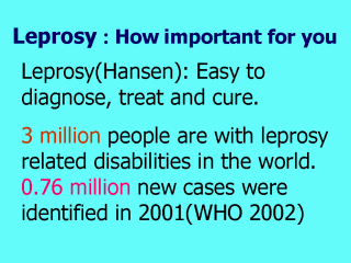 These patients still do not enjoy human rights fully in spite of medical advancements in the field of leprosy. In spite of intensive detection and Multi drug treatment (MDT), 12 out of 100 000 people still develop leprosy. http://www.who.int/lep/stat2002/global02htmEven in a technologically advanced country like North America, 110 new patients with Hansen’s disease were detected ( NHDP Report, 2001). |