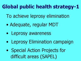 Leprosy Elimination Campaign (LEC) and Special Action Projects for Leprosy Elimination (SAPEL) are 2 important strategies to identify undetected cases using community volunteers (CV) and bring them under MDT to reduce infectivity pool (WHO,1994,1995). Geographic and patient coverage (even in most difficult hilly areas) and treatment completion are important to reduce disease transmission in the long run and bring down true incidence rate. http://www.who.int/lep/Elimination/Elimination0.htm Weekly Epidemiological Record,WHO, 2002,77,17-24: Leprosy Elimination campaigns |