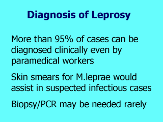 Page: Diagnosis www.who.int/lep/disease/disease.htm Simple training of health care workers in suspecting leprosy alone detected more than 454290 new cases in India during LEC (Dharmshaktu et al 1999, Leprosy Review ) http://www.leprosy-review.org.uk |