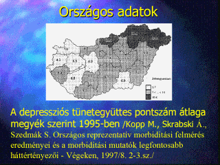 kétszer több, mint a férfiak közötti 10%! 2002-es vizsgálat alapján a 18 évnél idősebb népesség 27,3%-a panaszkodik depressziós tünetekről. Klinikai depresszió: 12,9%, súlyos:7,3%.1995-2002 között csökkent az enyhébb depresszió, a közepes és súlyos nem változott. Kismamákra vonatkozó adatok: A GYES-en lévő anyák 6,7%-a jövőjét reménytelennek látja. 33%-uk dohányzik. A GYES-en lévő anyák között az átlagnál többen, 19% panaszkodik tartós lehangoltságról! |