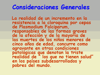 | Una de las causas responsables (por irresponsabilidad e insensibilidad) de la resistencia a los antipalúdicos es la comercialización y uso de medicamentos adulterados en países del Tercer Mundo. |