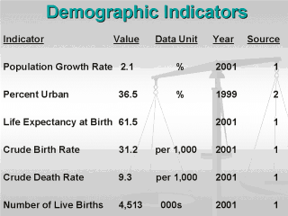 | 1. BUCEN - IDB-2000. United States Census Bureau, International Programs Center. International Database, October 2000.2 . WB/WDI-2001. World Bank Development Indicators 2001, CD Rom. Washington, DC: the World Bank, 2001. |