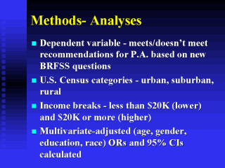 | For analyses: the dependent variable physical activity was dichotomized into meeting recommendations or not meeting recommendations for physical activity U.S census categories of inside urban, outside urban rural farm and rural non-farm were collapsed in to urban, suburban and rural Dichotomous income grouping similar to those used in other national studies were used to allow comparability ( <20K= lower, >20K higher)Logistic regressions of meeting recommendations for six categories (3 urbanicity X 2 income) were adjusted for potential confounders: :age, gender, education and race OR’s and 95% CI reported. |