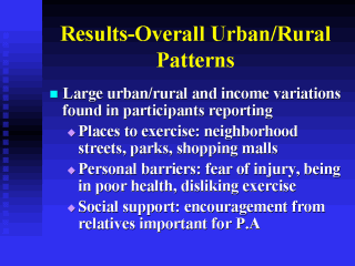 neighborhood streets... 52% R,H ; 74% U,L streets 14% R,L ; 39% U,L parks 28% S,H ; 44% U,L malls personal barriers…those fear of injury… 5% R,H ; 12% U,L fear 6%U,H ; 17% R,L bad health 8% R,L ; 19% S,H dislike social support…those reporting encouragement from relatives…. 60% U,L ;73% S,L encouragement from relatives |