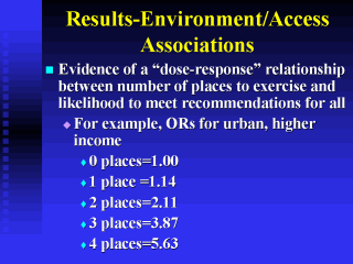 those reporting 1 place to exercise (regardless of what that place was) were 1.14 times more likely to meet recommendations than those without any place to exercise.